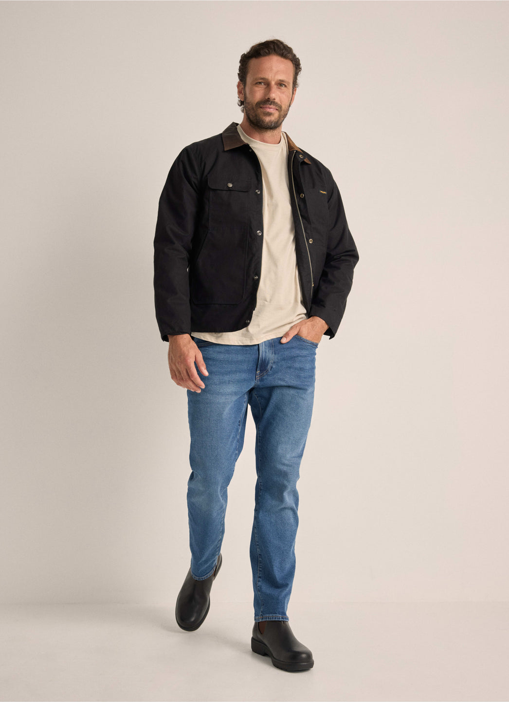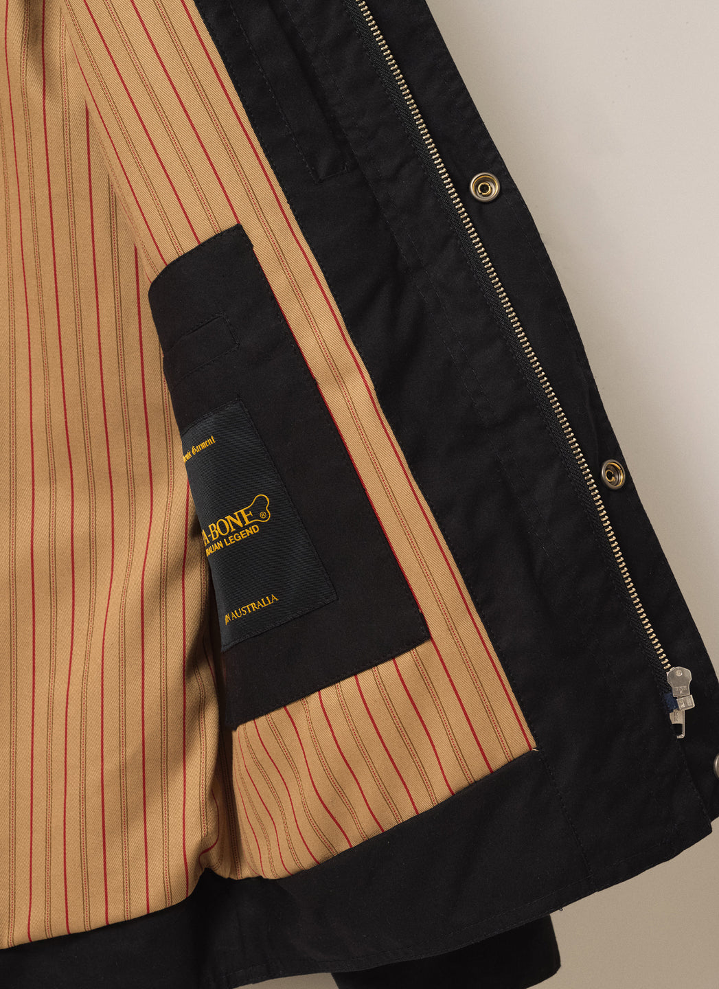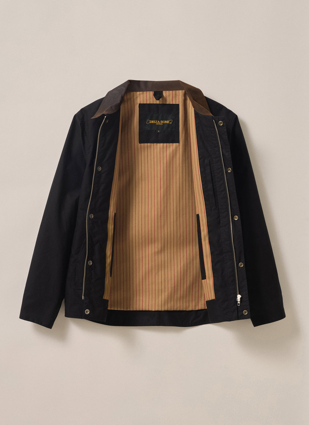 Worker Jacket, made for Australian conditions. Features a durable waxed cotton finish, kangaroo leather collar, sturdy zip with studded flap, adjustable cuffs and side tabs, multiple pockets, and a scooped back hem. Fully lined with striped 100% cotton for breathable, all-day comfort.