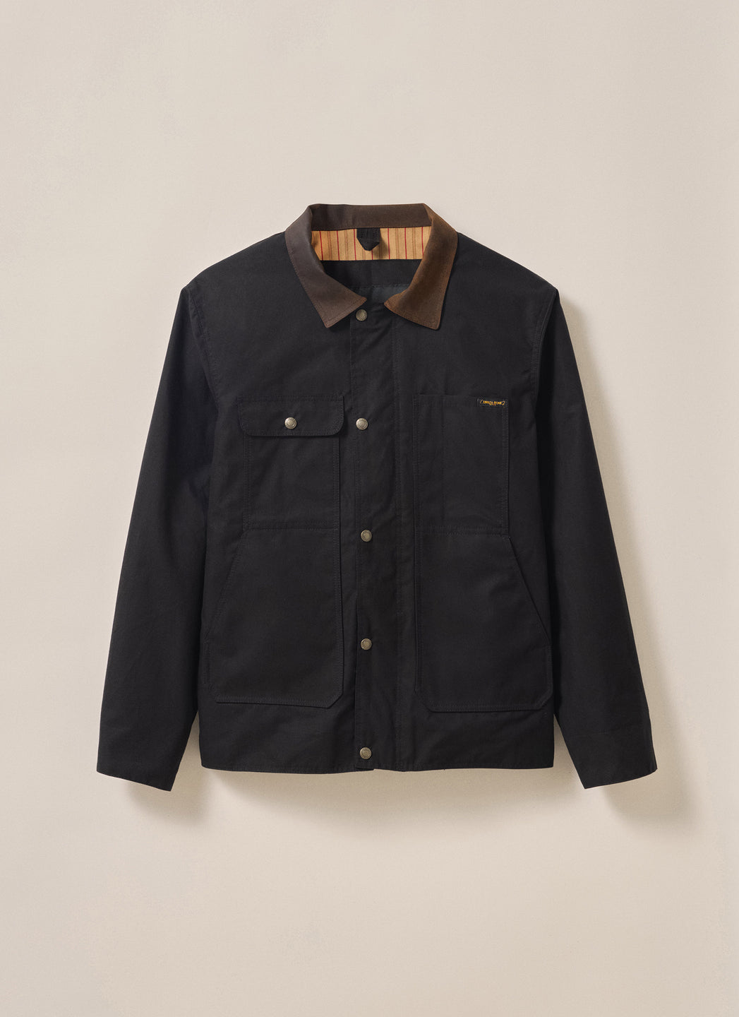 - Front placket with nickel zipper and storm flap with snap closures to keep water out